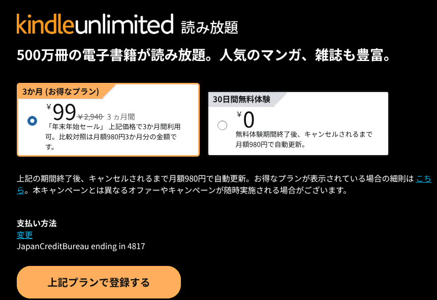 ユーザーごとに異なる内容が提示される場合があるため、まずはKindle Unlimitedの登録ページで確認してみましょう。